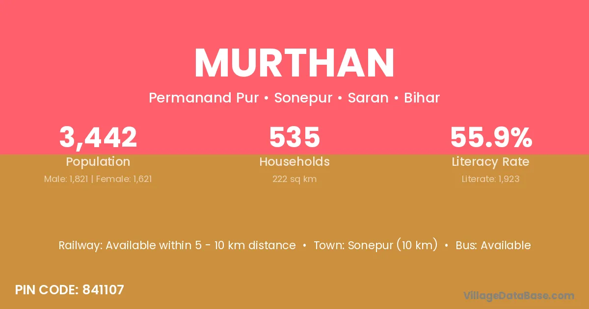 Murthan village has a total population of 3,442 people, of which 1,821 are males and 1,621 are females.