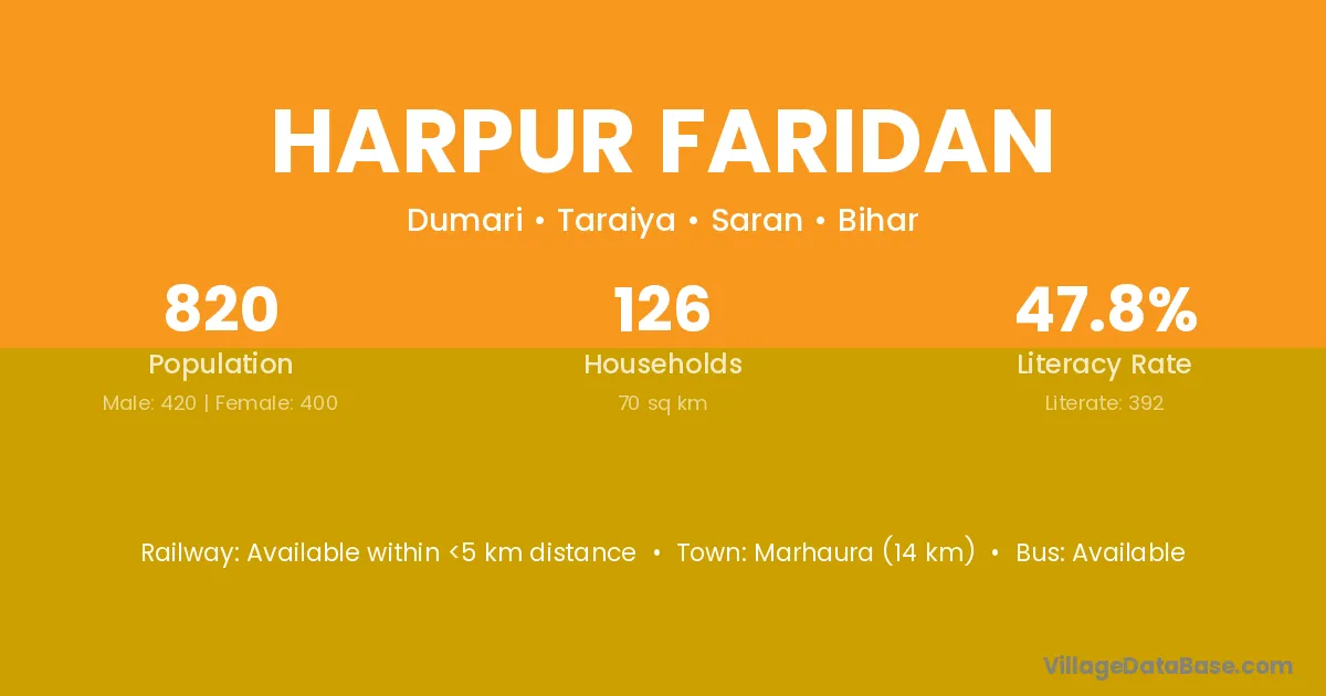 Marhaura (14 km) is the nearest town to Harpur Faridan village for major economic activities and is located approximately 14 km away.