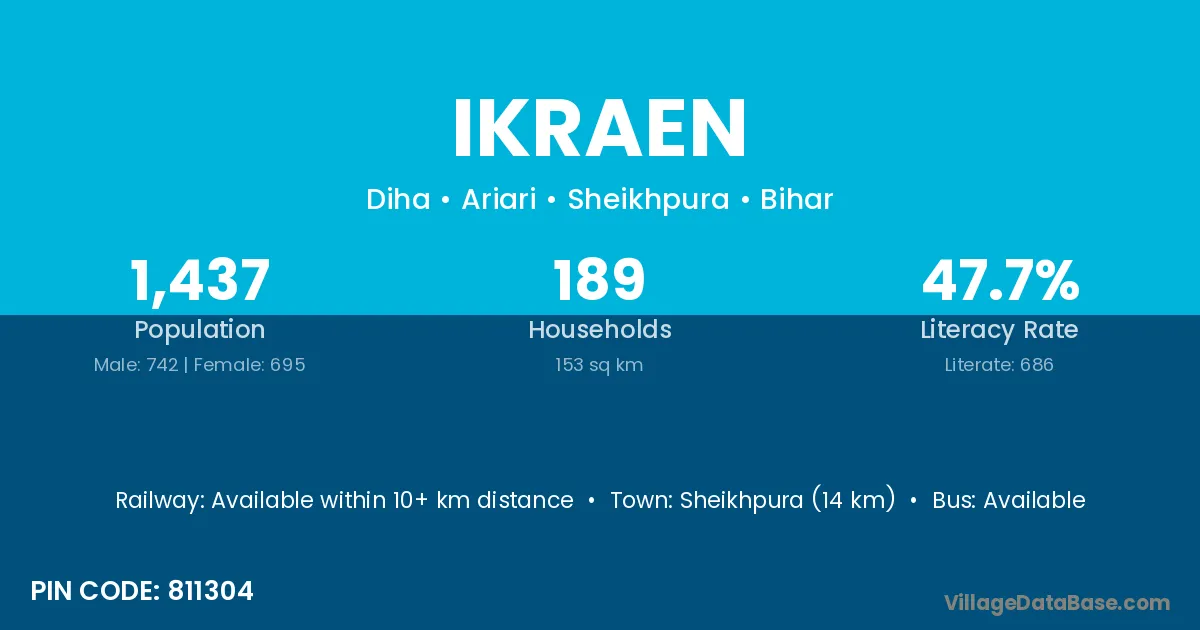 Sheikhpura (14 km) is the nearest town to Ikraen village for major economic activities and is located approximately 14 km away.
