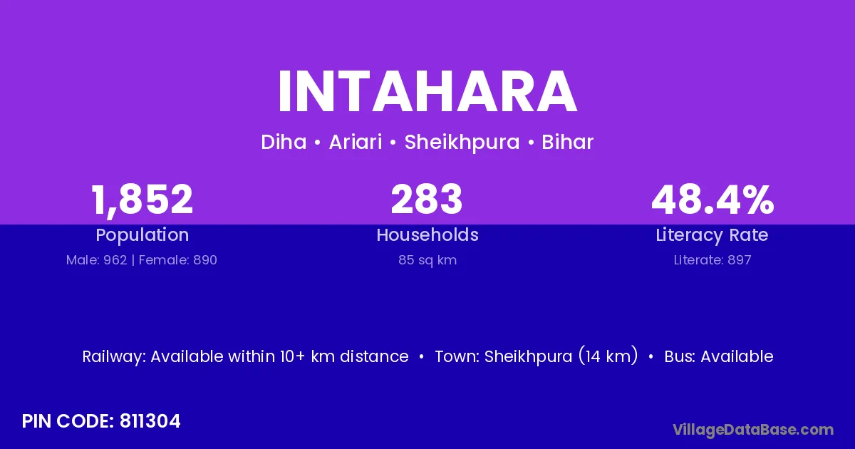 Sheikhpura (14 km) is the nearest town to Intahara village for major economic activities and is located approximately 14 km away.