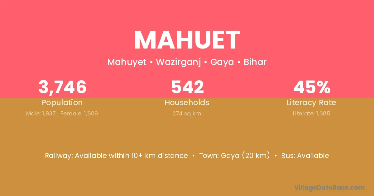 Sheikhpura (17 km) is the nearest town to Mahuet village for major economic activities and is located approximately 17 km away.