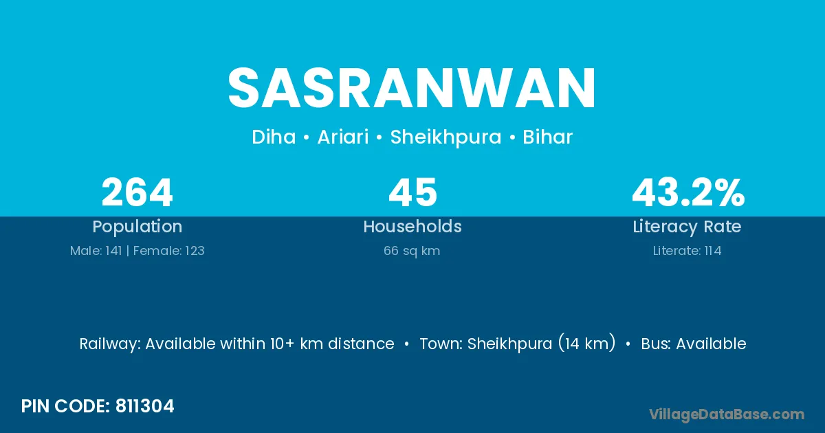Sheikhpura (14 km) is the nearest town to Sasranwan village for major economic activities and is located approximately 14 km away.