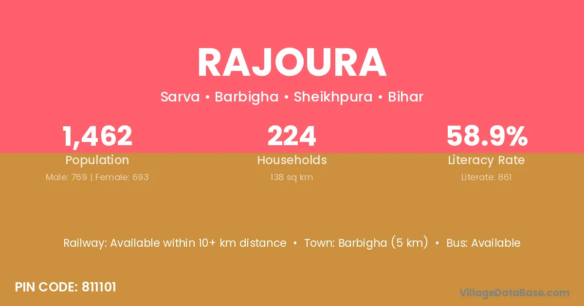 Barbigha (5 km) is the nearest town to Rajoura village for major economic activities and is located approximately 5 km away.
