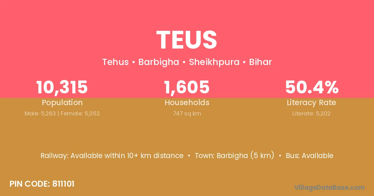 Barbigha (5 km) is the nearest town to Teus village for major economic activities and is located approximately 5 km away.