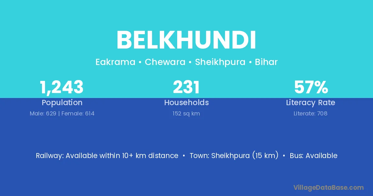 Sheikhpura (15 km) is the nearest town to Belkhundi village for major economic activities and is located approximately 15 km away.