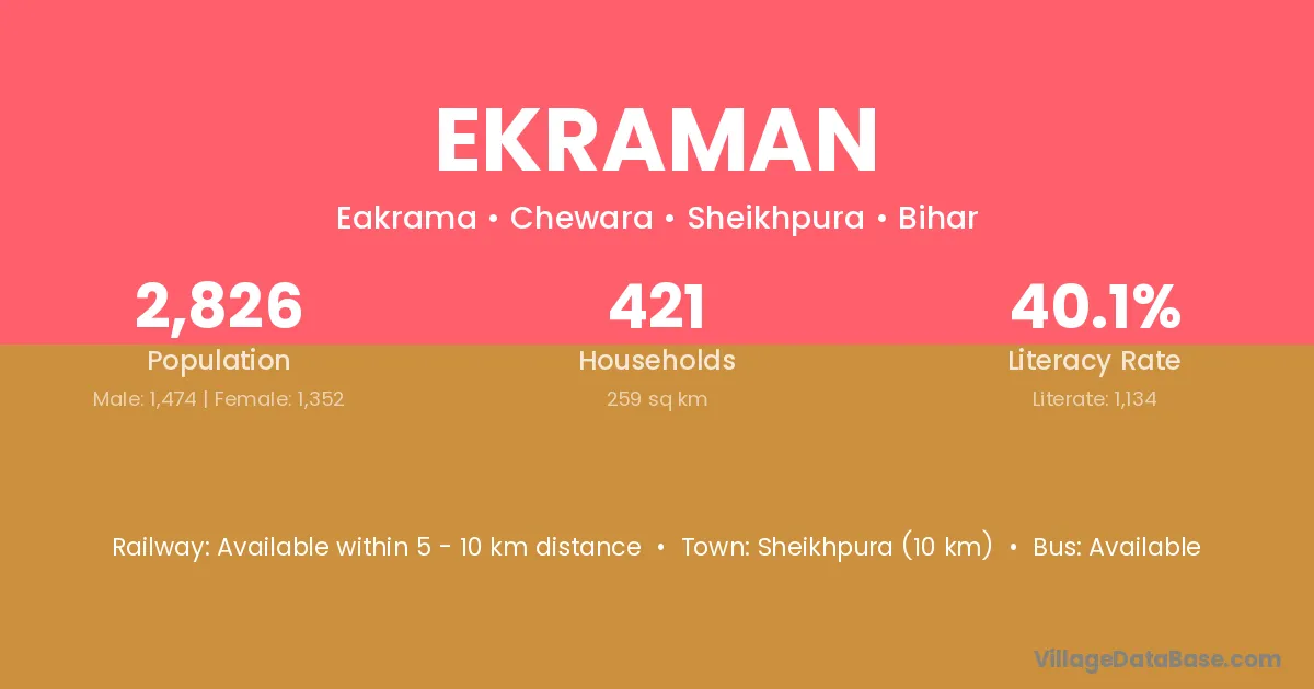 Sheikhpura (10 km) is the nearest town to Ekraman village for major economic activities and is located approximately 10 km away.