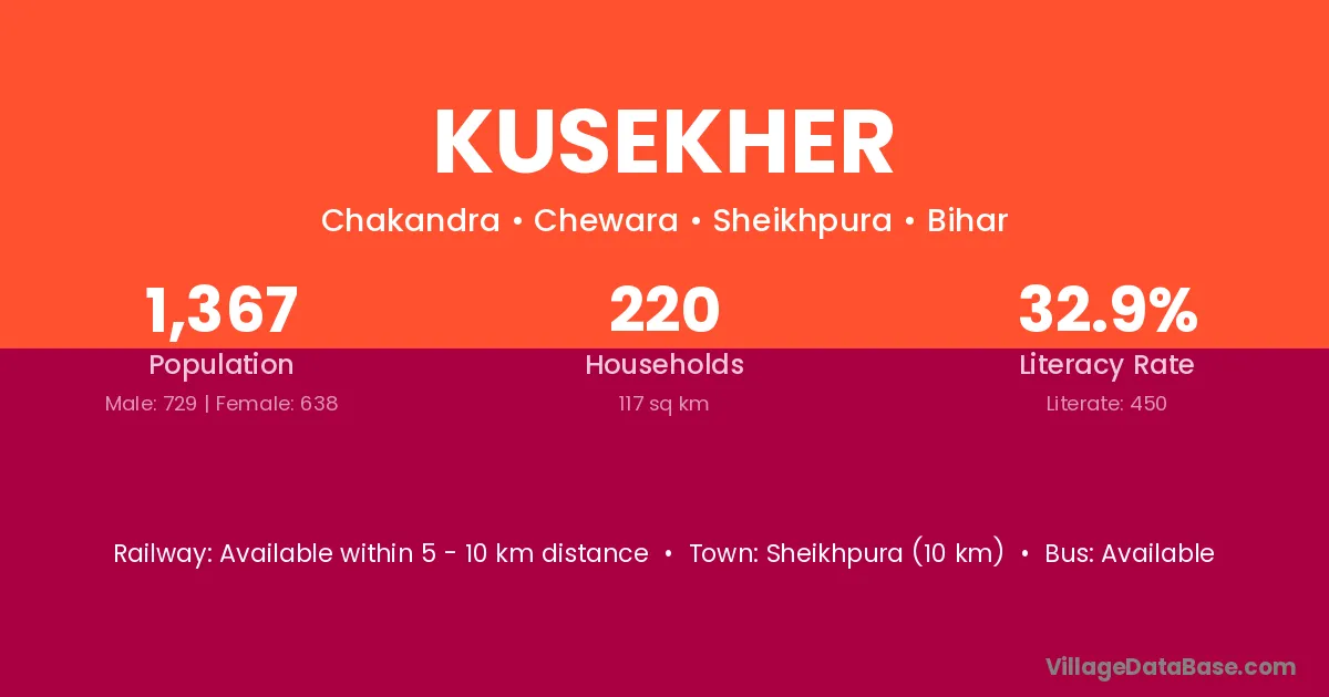 Sheikhpura (10 km) is the nearest town to Kusekher village for major economic activities and is located approximately 10 km away.