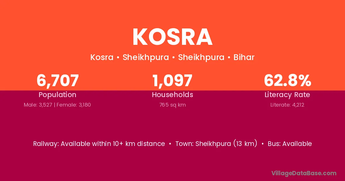 Sheikhpura (13 km) is the nearest town to Kosra village for major economic activities and is located approximately 13 km away.