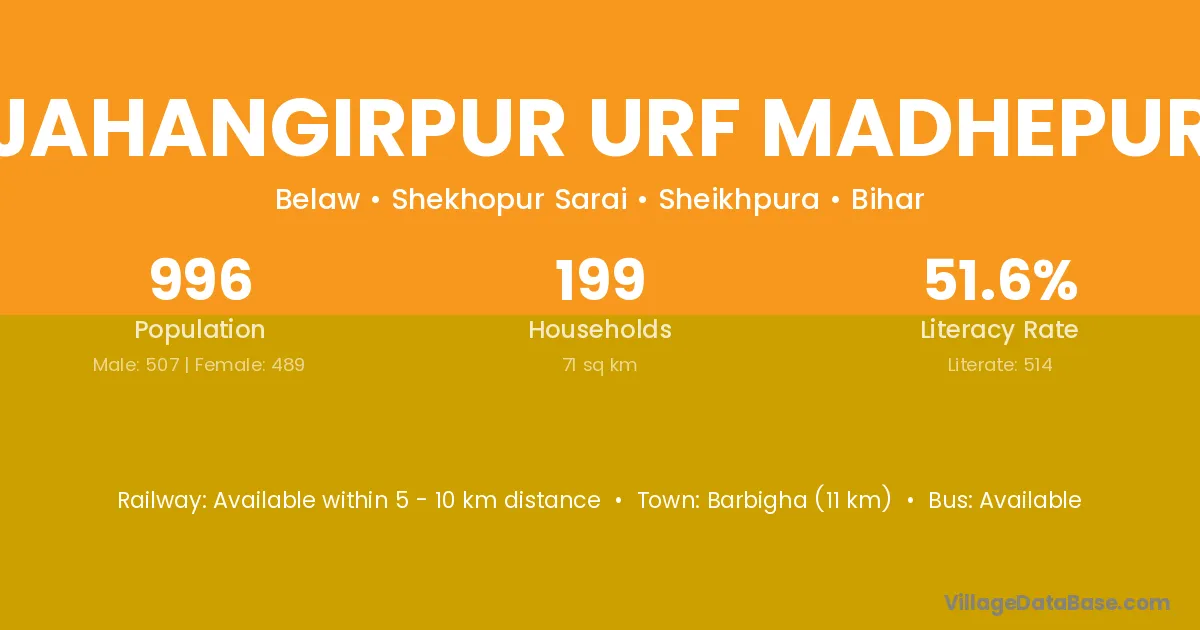 Jahangirpur Urf Madhepur village has a total population of 996 people, of which 507 are males and 489 are females.
