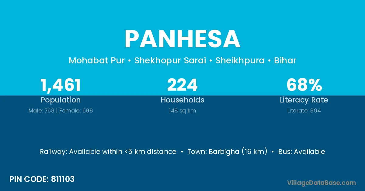 Barbigha (16 km) is the nearest town to Panhesa village for major economic activities and is located approximately 16 km away.
