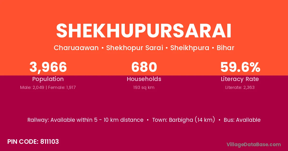 Barbigha (14 km) is the nearest town to Shekhupursarai village for major economic activities and is located approximately 14 km away.