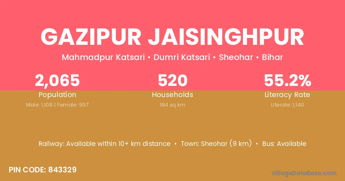 Sheohar (9 km) is the nearest town to Gazipur Jaisinghpur village for major economic activities and is located approximately 9 km away.