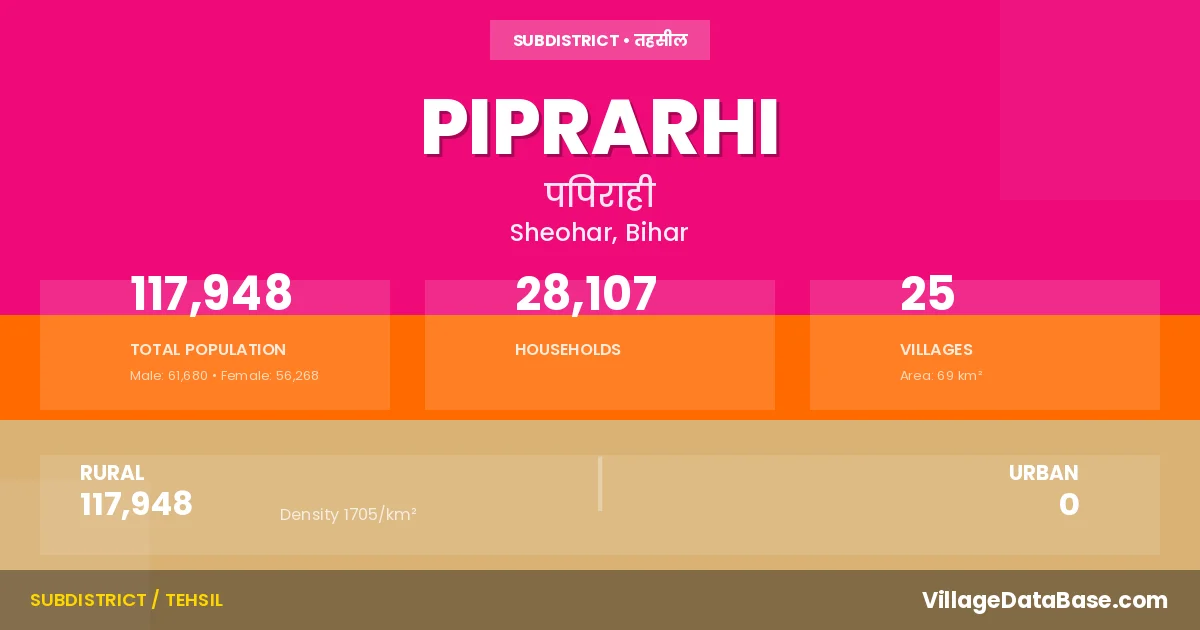 Piprarhi is a town and Subdivision in the Sheohar district of the Bihar. In India, a Subdivision is a subdivision of a district responsible for the administration and revenue collection of a specific area within the district. Subdivisions play a crucial role in the local governance structure, contributing significantly to the development and administration of their communities.