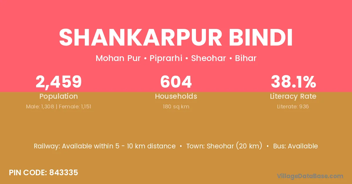 Sheohar (20 km) is the nearest town to Shankarpur Bindi village for major economic activities and is located approximately 20 km away.