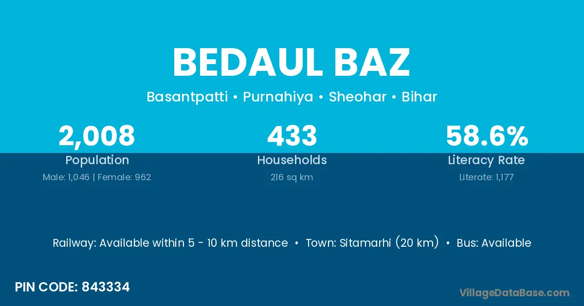 Sitamarhi (20 km) is the nearest town to Bedaul Baz village for major economic activities and is located approximately 20 km away.