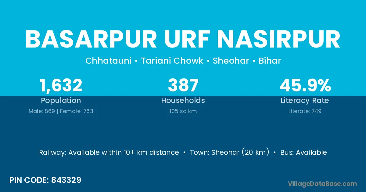 Sheohar (20 km) is the nearest town to Basarpur Urf Nasirpur village for major economic activities and is located approximately 20 km away.