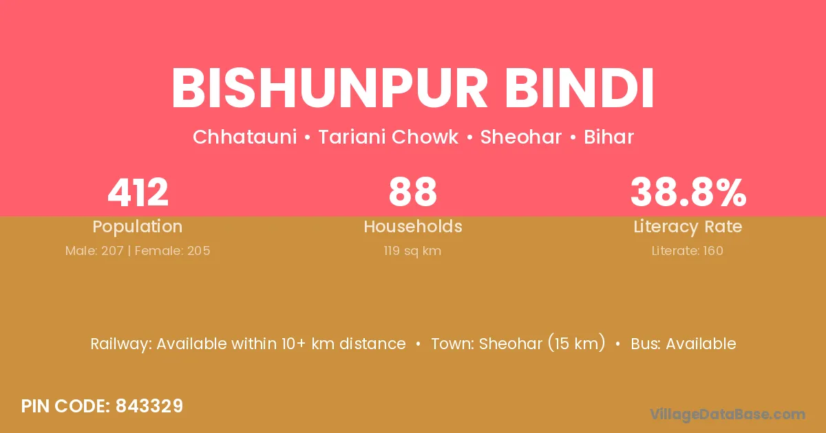 Sheohar (15 km) is the nearest town to Bishunpur Bindi village for major economic activities and is located approximately 15 km away.