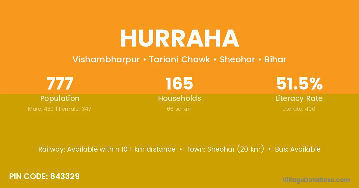 Sheohar (20 km) is the nearest town to Hurraha village for major economic activities and is located approximately 20 km away.
