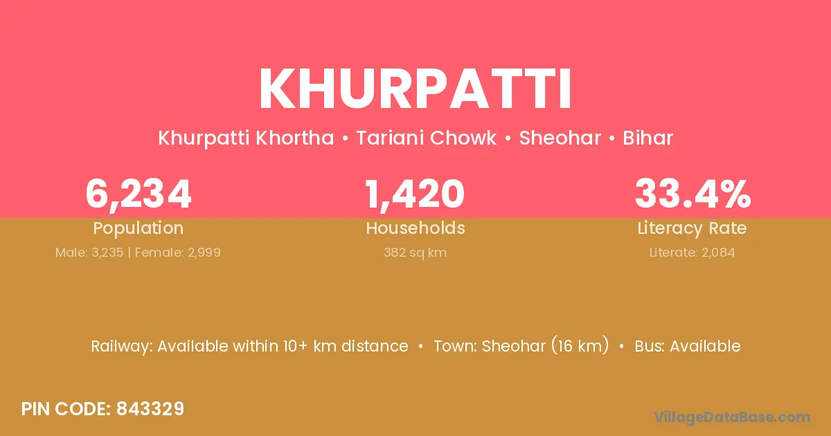 Sheohar (16 km) is the nearest town to Khurpatti village for major economic activities and is located approximately 16 km away.
