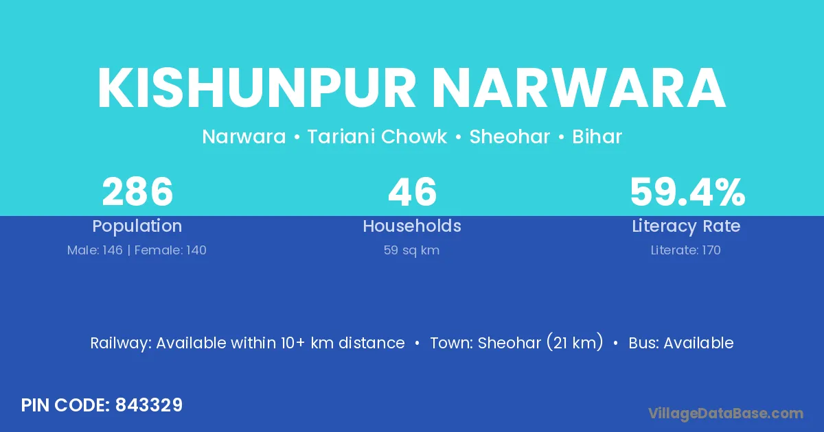 Sheohar (21 km) is the nearest town to Kishunpur Narwara village for major economic activities and is located approximately 21 km away.