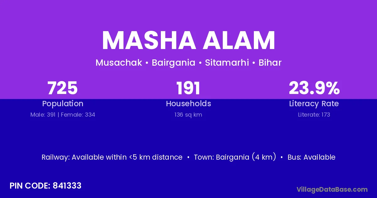 Bairgania (4 km) is the nearest town to Masha Alam village for major economic activities and is located approximately 4 km away.