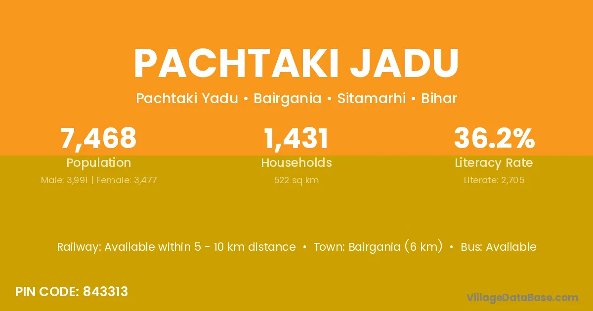 Bairgania (6 km) is the nearest town to Pachtaki Jadu village for major economic activities and is located approximately 6 km away.