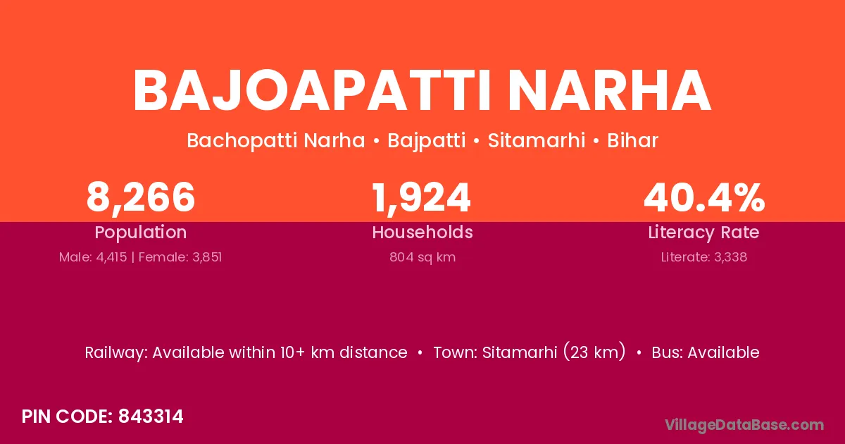 Sitamarhi (23 km) is the nearest town to Bajoapatti Narha village for major economic activities and is located approximately 23 km away.