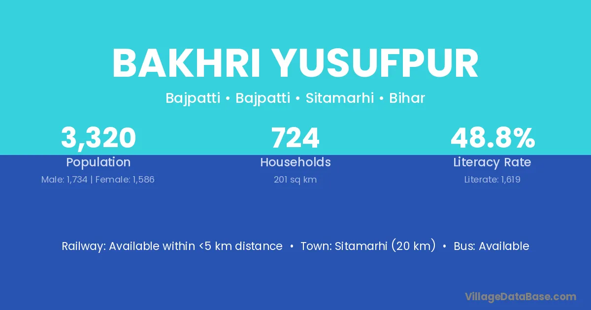 Sitamarhi (20 km) is the nearest town to Bakhri Yusufpur village for major economic activities and is located approximately 20 km away.