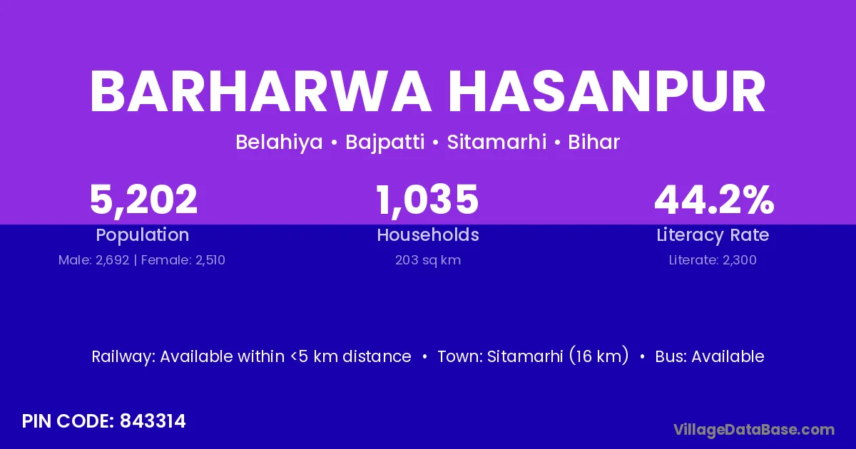 Sitamarhi (16 km) is the nearest town to Barharwa Hasanpur village for major economic activities and is located approximately 16 km away.