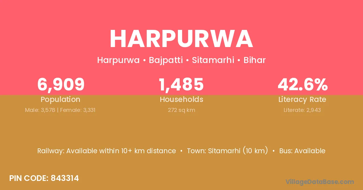 Sitamarhi (10 km) is the nearest town to Harpurwa village for major economic activities and is located approximately 10 km away.
