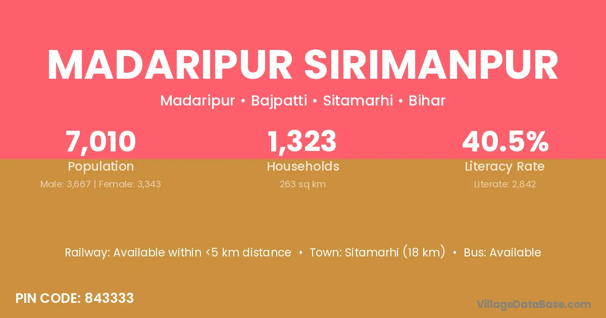 Sitamarhi (18 km) is the nearest town to Madaripur Sirimanpur village for major economic activities and is located approximately 18 km away.