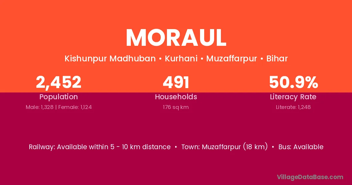 Sitamarhi (5 km) is the nearest town to Moraul village for major economic activities and is located approximately 5 km away.