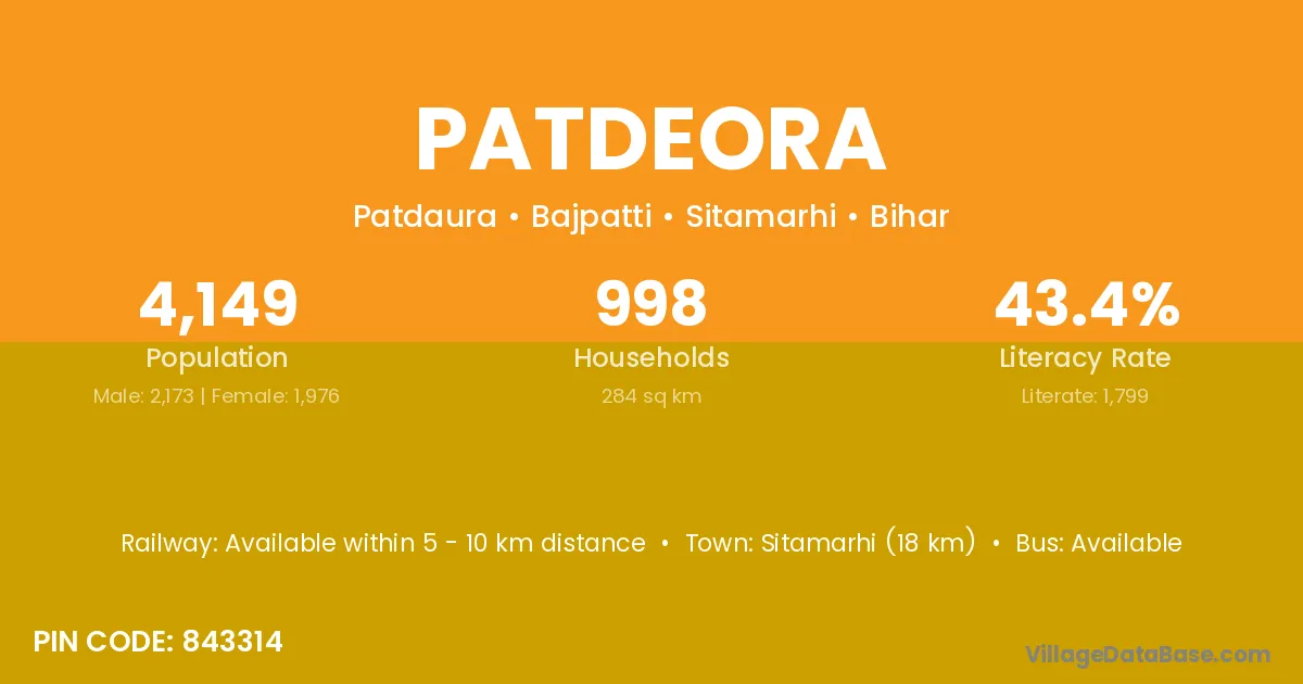 Sitamarhi (18 km) is the nearest town to Patdeora village for major economic activities and is located approximately 18 km away.