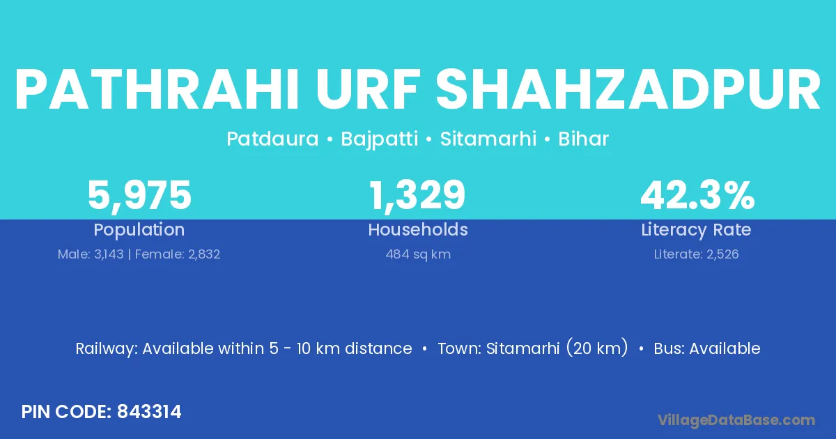 Sitamarhi (20 km) is the nearest town to Pathrahi Urf Shahzadpur village for major economic activities and is located approximately 20 km away.