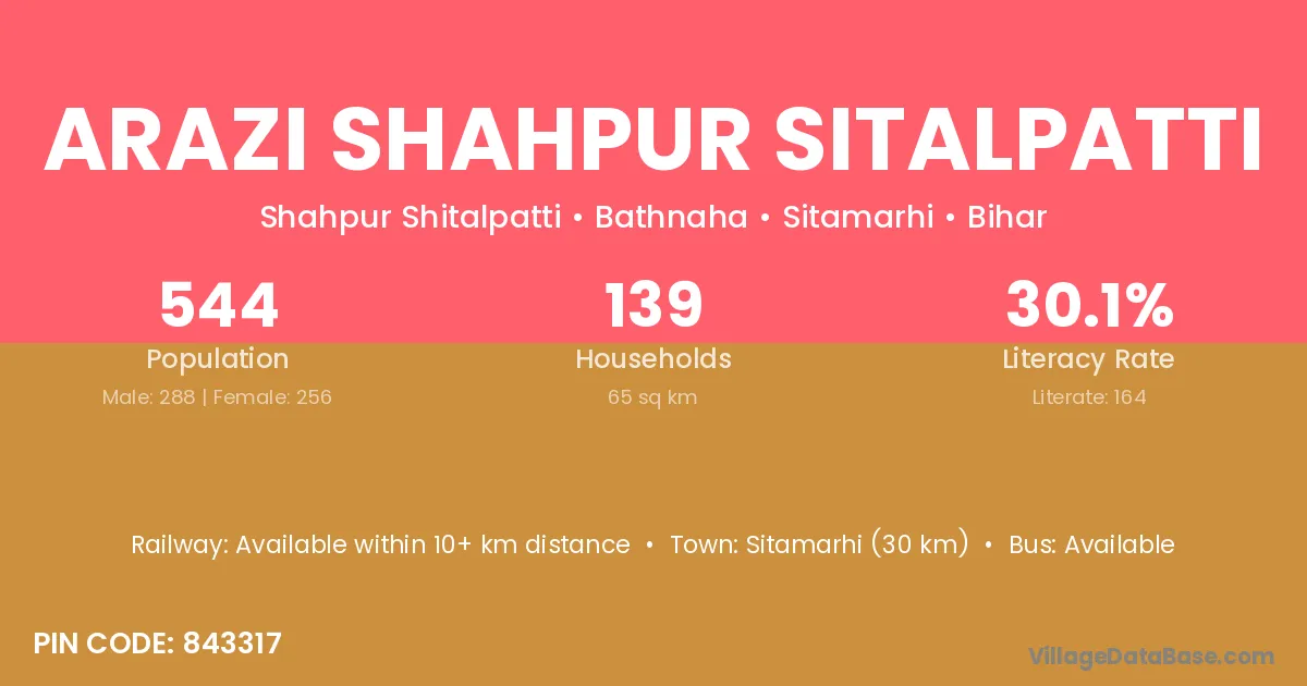 Sitamarhi (30 km) is the nearest town to Arazi Shahpur Sitalpatti village for major economic activities and is located approximately 30 km away.