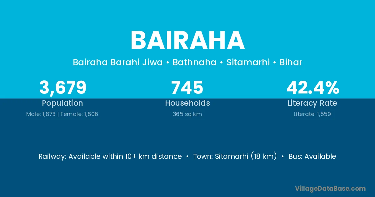 Sitamarhi (18 km) is the nearest town to Bairaha village for major economic activities and is located approximately 18 km away.