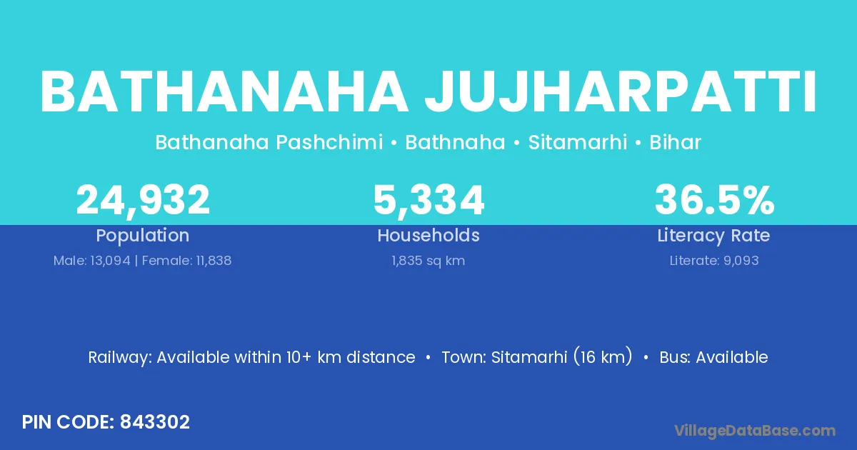 Sitamarhi (16 km) is the nearest town to Bathanaha Jujharpatti village for major economic activities and is located approximately 16 km away.