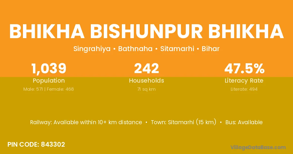 Bhikha Bishunpur Bhikha village has a total population of 1,039 people, of which 571 are males and 468 are females.