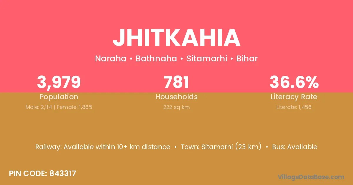 Sitamarhi (23 km) is the nearest town to Jhitkahia village for major economic activities and is located approximately 23 km away.