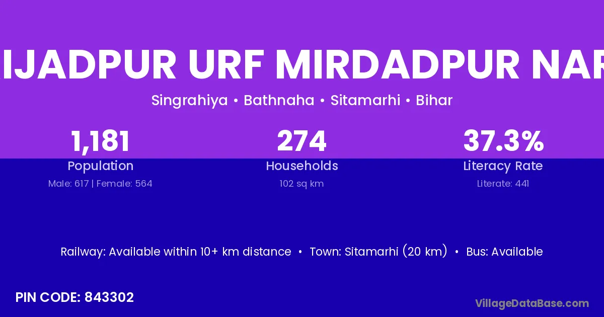 Sitamarhi (20 km) is the nearest town to Mirijadpur Urf Mirdadpur Narha village for major economic activities and is located approximately 20 km away.