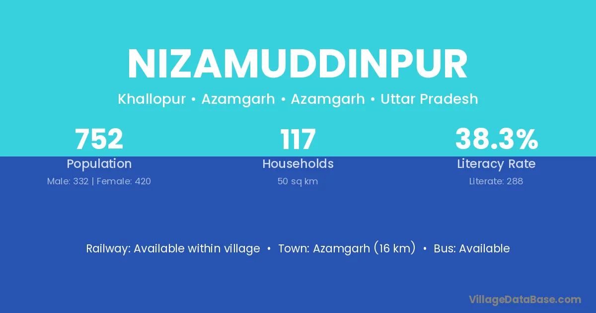 The literacy rate of Nizamuddinpur village is 39.79%. Male literacy stands at 45.26% and female literacy at 33.60%.