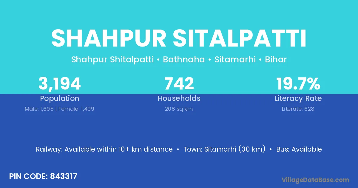 Sitamarhi (30 km) is the nearest town to Shahpur Sitalpatti village for major economic activities and is located approximately 30 km away.