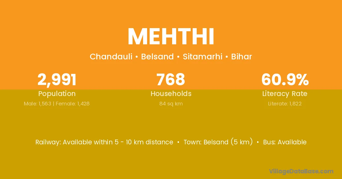 Belsand (5 km) is the nearest town to Mehthi village for major economic activities and is located approximately 5 km away.