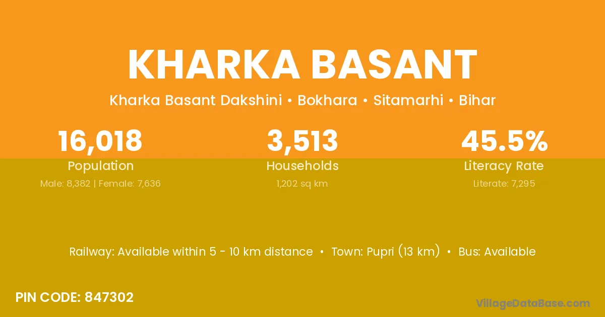Pupri (13 km) is the nearest town to Kharka Basant village for major economic activities and is located approximately 13 km away.