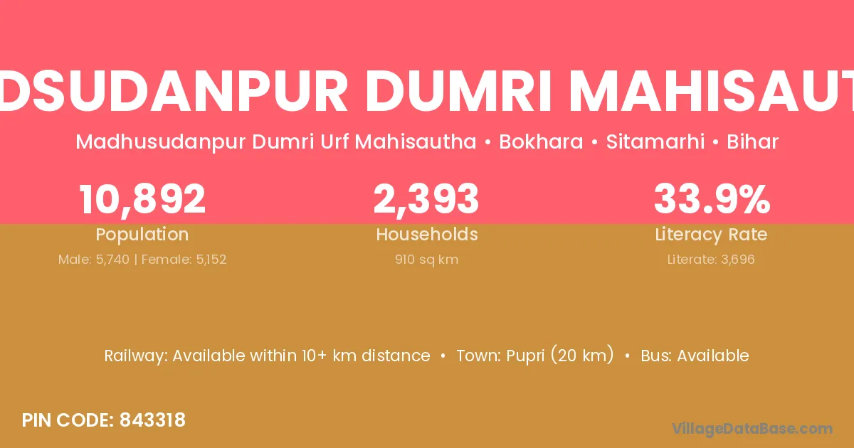 According to Census 2011 information, the village code of Madsudanpur Dumri Mahisautha village is 843318.