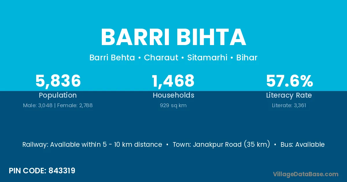 Janakpur Road (35 km) is the nearest town to Barri Bihta village for major economic activities and is located approximately 35 km away.