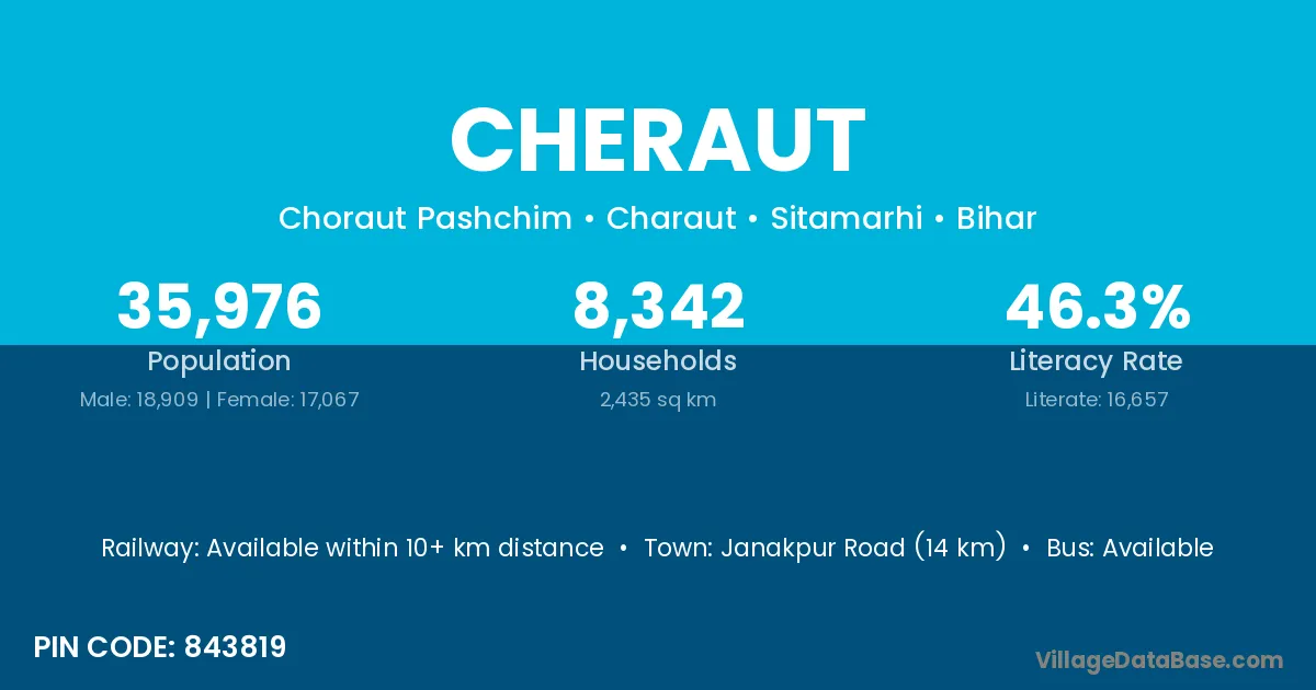 Janakpur Road (14 km) is the nearest town to Cheraut village for major economic activities and is located approximately 14 km away.