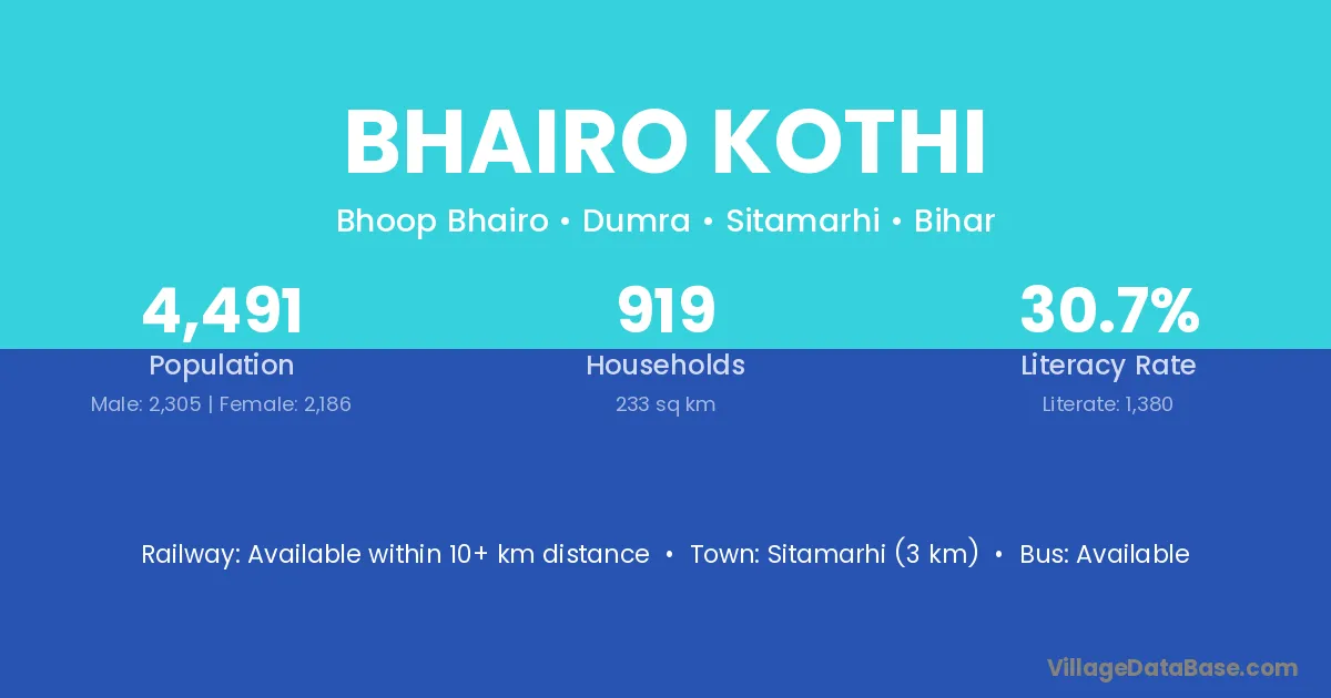 Sitamarhi (3 km) is the nearest town to Bhairo Kothi village for major economic activities and is located approximately 3 km away.