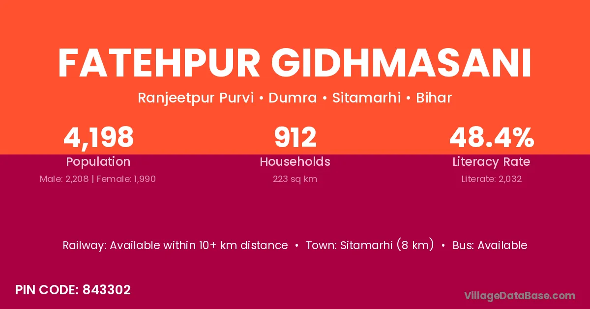 Sitamarhi (8 km) is the nearest town to Fatehpur Gidhmasani village for major economic activities and is located approximately 8 km away.