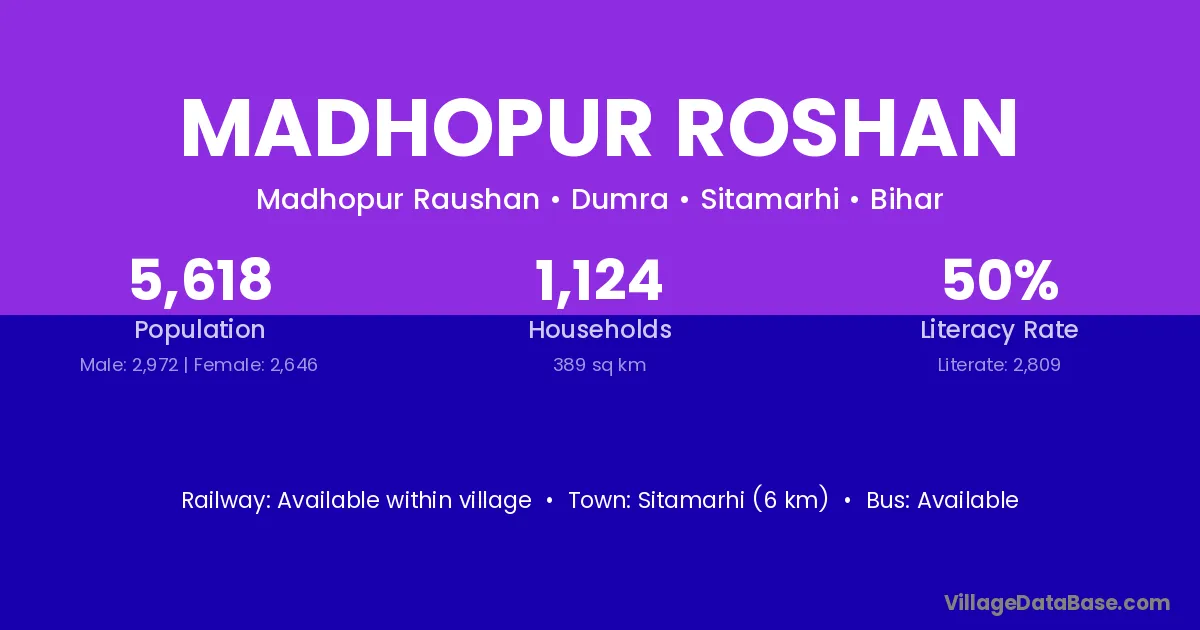 Sitamarhi (6 km) is the nearest town to Madhopur Roshan village for major economic activities and is located approximately 6 km away.